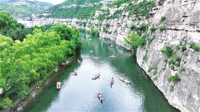 临近暑期结束,我市各景点迎来旅游高峰。图为汾河二库国家水利风景区内,游客乘着竹筏徜徉山水间,饱览美好景致,乐享假日时光。