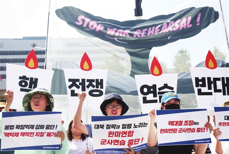 参加集会的韩国民众手持“反对核战争演练”“拒绝军事演习,构建沟通渠道”等标语,高呼“反对参加韩美军演”“停止韩美军演”等口号。