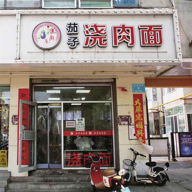 8月12日上午11时许,近午的阳光耀眼。在云卷云舒的映衬下,繁华热闹的桃园路反而显出了一丝静谧从容。位于桃园南路的茄子浇肉面馆窗明几净,尽管尚未到就餐时段,但店里已经迎来了第一波食客。不一会儿,前厅后堂16张桌已坐满了宾客,吸溜面条的声音此起彼伏。面馆分工明确,老板娘温爱招呼客人端面递菜、老板胡素勇备料炒卤、帮工负责前厅后厨杂事……相互协作有条不紊。他们围绕着这个小店,辛苦而幸福地奔忙着;他们用一碗舒心的“家味儿”,慰藉人们的千绪愁肠。