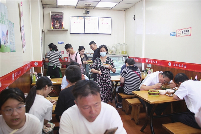 浇头是面的灵魂。“作料和食材都是家里常见的,关键是确保新鲜和品质,另外就是要炒透、炖透,以便充分释放其香气和口感。”温爱告诉记者,店里有专人负责每天早上去市场现选采买,为的就是挑到最新鲜、有品质的食材。上午10时许,胡素勇就会到店炒制浇头。炒茄子卤,先用小火煸炒,去除苦涩味和多余水分,然后放入花椒八角、葱姜蒜末翻炒出香味。炒到茄丁变软后,加入作料,转小火炖煮至茄子软烂入味,前后过程至少得一小时以上。小炒肉,精选上等五花肉,肉片厚度保持在3毫米到4毫米,热锅冷油小火慢炒,关键要把肉里脂肪充分煸出来,让每一片炒肉都散发着诱人的香气……