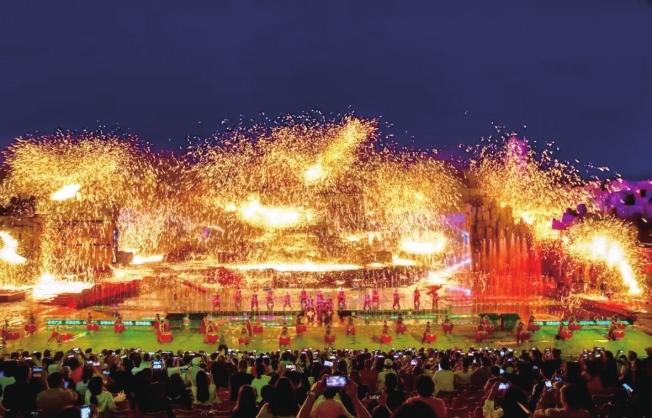 舞台上,几座高大的假山静静矗立,随着一阵低沉的乐声,舞台剧演员缓缓动作,匠人们也开始忙碌起来,他们身着单薄的护身服,头戴斗笠,手持铁棒与铁勺,神情专注而庄严。