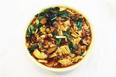 闫玉宏制面手法极其娴熟,脊骨先行,烧肉垫后,口蘑、香菇、木耳、海米纷纷“入场”,骨汤为底,生粉勾芡,蛋液锁香,卤上浇油,最后撒上一把新鲜的韭菜,“灵魂卤子”出锅。面条也很有讲究,闫玉宏沿用北郊传统碱水拉面的做法,碱水面条在沸水中煮熟后,仍保持了爽滑筋道的口感,浇上卤子,每一根面都吸饱了卤汁,一碗鲜、香、浓、醇的打卤面就上桌啦。面条的筋道与卤子的浓郁完美融合,既满足了味蕾的享受,又让人感受到了家的温暖和幸福。