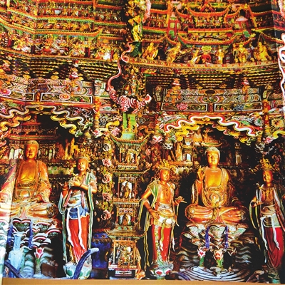 移步向右,十大弟子或喜或怒,或思或嗔,或慈或厉,或贤或聪,尽显个性。再看从壁塑半掩半开的门里探出身子的两个小沙弥,一个端着茶,憨态可掬带一点怯意,大概茶壶很烫,习惯性地用衣袖垫在壶底,让人心生怜爱;另一个双手托盘,目光平视,给人的感觉老到成熟,多半是空门生活多年,一切都在掌握之中,参观者无不拍手叫绝。环顾整个殿堂,大塑像雅而不俗,小悬塑小巧玲珑,在1000多尊塑像中,配合人物活动而设置的天宫楼阁、亭台水榭、飞禽走兽、飞龙舞凤各有妙相,有的尽凌空舞蹈之能事,呈现出一派仙宫佛国的景象。