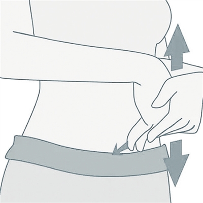 3.一手在肚脐上,一手在肚脐下,各自从左右两边肋骨下边两手交替来回拉按,共100次。