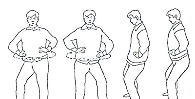 2.旋带脉法:两手掐腰,直立,膝微弯。脚趾微微扣地,膝有内裹之意,坐胯,保持尾闾中正,以尾骨划圆旋转。左右各旋转8次,一天至少做2次旋腰动作。