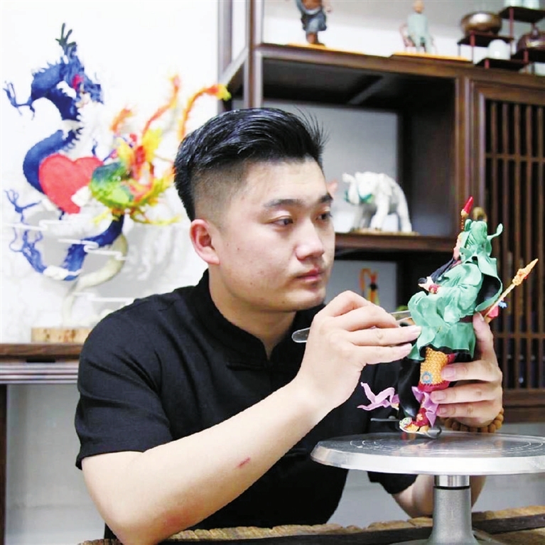 在他的指尖,红脸的关公手托长髯、持刀而立,衣袂好似随风摆动,仔细观察一番后,他又用小竹刀轻压几下,调整衣服上褶皱,一搓一捏一揉,器宇轩昂的关公便呈现眼前。记者注意到,杨刚创作时,手中并没有作品画稿,而是心随意动,直觉不对的地方便上手调整。细问之下才得知原委。“脑子里早就做好了3D构图,我虽然画不出来,但捏出来就很顺手。”