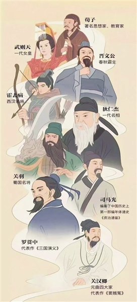 写思想家荀子,写春秋霸主晋文公,写一代女皇武则天,写关羽的忠贞,写霍去病的骁勇,写狄仁杰的孤忠,写“天下第一廉吏”于成龙的忠义……