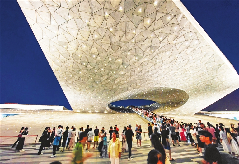 随着游戏《黑神话:悟空》大热,我市各旅游景点迎来客流高峰。图为8月30日晚,太原植物园“时光电梯”吸引众多游客拍照留念。