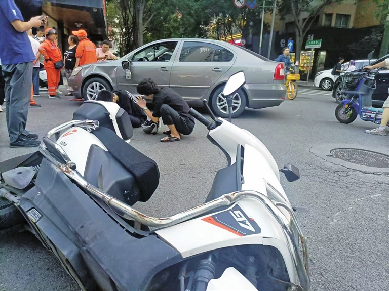 一位环卫工介绍,汽车主驾一侧与电动自行车相撞,后者倒地并滑行了约5米。汽车的后视镜、车门严重受损。电动自行车上两名男子均未戴头盔,有不同程度受伤。急救车赶来,将两名伤者送往医院。交警赶到现场勘察,并调取了附近公共视频,对事故展开调查处理。