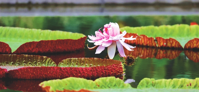 王莲虽然叶片巨大,开的花却不怎么大,比荷花小多了,而且只开3天,有点吝啬。但王莲的花很有趣,每天颜色各异,第一天傍晚初开时为白色,芳香浓郁;第二天逐渐闭合,傍晚再次绽放时则是淡红色;第三天又变成粉红色,随后枯萎,沉入水中。由于这一特性,王莲又被称为“善变的女神”。
