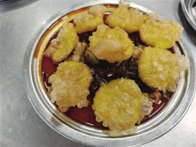 苔蘑土鸡扒糕,又是一道与“糕”相关的美食。底部铺大同粉条,再将炒好的苔蘑土鸡放入锅中,最上层放上炸好的素糕,上桌后小火慢炖……来自大同的安先生是餐馆常客,这个菜是他的常点菜品,“糕很正宗、苔蘑很鲜、土鸡很嫩,好吃,点赞!”