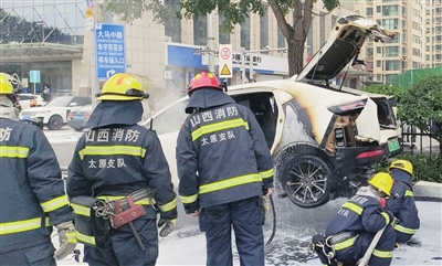 见此情况,为防止汽车电池组发生爆炸,交警迅速对该路段进行管控,并设法在消防救援人员到来之前尽量控制火势。此时,一辆环卫水罐车正在附近,看到火势后迅速到位,从起火汽车的后方约20米处喷水,压制火势,争取后续救援时间。很快,消防救援人员赶到,接管灭火,经过约半个小时扑救,明火基本熄灭,消防员持续对车体降温,交通逐渐恢复。