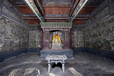 正殿内东西两侧山墙和后墙上绘满了壁画,共有80余幅,如连环画,绘着“桃园结义”“过五关斩六将”“单刀赴会”“华容道义释曹操”等,展现了关帝的生平事迹。这些壁画栩栩如生,相传为明代作品。