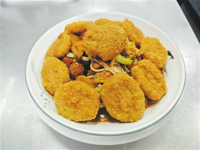 除了这些,迎宾楼的创意菜也深受食客喜欢。百香果酥梨虾,名字看起来就很有食欲,这道菜酸甜可口,女孩子们最爱。茄子炖江团,微麻辣、椒香味,绝对下饭菜。