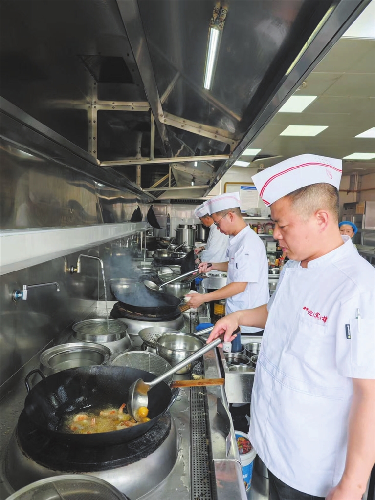 9月4日上午11时,阳光正好。迎宾楼后厨窗明几净,餐具厨具码放得整整齐齐。阳光透过玻璃照进厨房,清洗干净的白色餐具光洁如玉。厨房里贴着一行标语——“态度决定一切,细节决定成败”。标语耳熟能详,而迎宾楼的厨师们,也用自己的一炒一颠、一擦一放来证明,这绝不仅仅是一行标语而已。