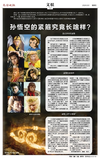 我们后来在影视剧中看到的各式各样的紧箍,已经超出了“金线儿”的范畴,基本上都进行了新的艺术加工设计,这样做大概也是为了让紧箍更加显眼。毕竟孙悟空本来就满身棕黄色的毛,细细的金线状紧箍戴在他头上或许立马就“隐身”了,根本看不到。将紧箍加粗加宽,雕镂花纹,甚至加上新的图案元素后,兼具美感和存在感,一眼看过去就能锁定他头上标志性的紧箍。
