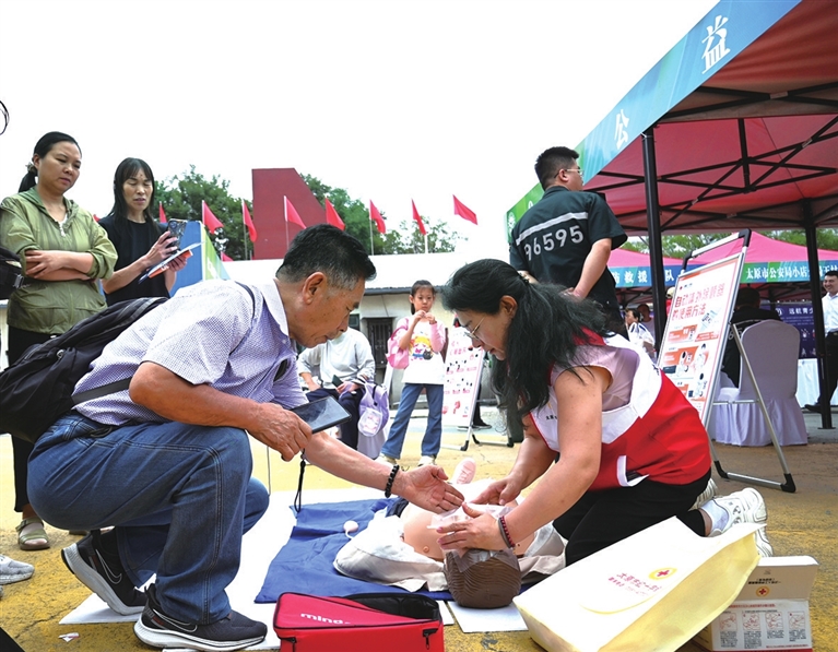 9月7日,由市养老产业促进会主办的第二届太原市“久久敬老生活服务节”在山西省体育场举行,活动以促进本地康养、养老产业发展为目的,营造良好的敬老、爱老、助老社会氛围。图为太原急救中心工作人员为群众科普急救知识。 王昕 郭苑甫 摄影报道