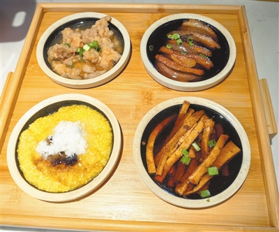 目前店里有20多种蒸菜,主要包含河东四小碗、猪肉大葱蒸菜、茼蒿蒸菜、油麦菜蒸菜、一面情深、清蒸排骨、清蒸鸡块等,每个都极具特色。比如,河东四小碗是指扣肉、酥肉、馏米、豆腐条,其中,扣肉中间夹着梨片,比较解腻,口感极好;酥肉外面裹一层面,需先炸后蒸;馏米融合了优良红枣,具有营养价值;豆腐条需切片后去炸,再切成条状。一面情深是由胡萝卜丝和面蒸成。