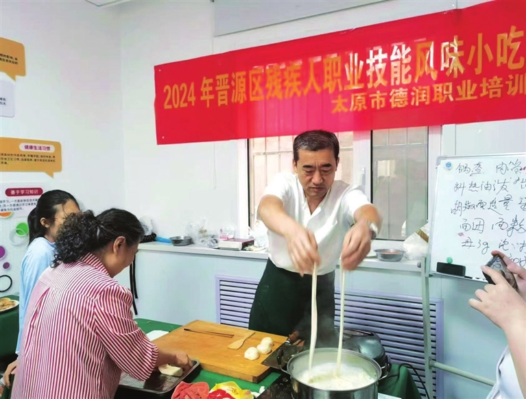 此次培训活动特邀太原市德润职业培训学校资深老师授课,采取“理论教学+老师演练+学员实操”相结合的方式,为残疾学员量身定制传统特色风味小吃培训课程,从小吃食材选购与搭配、烹饪技巧、食品安全及卫生标准等多个方面进行指导教学,力求让每位学员都能全面掌握风味小吃的制作精髓,激发他们学习技能的动力和兴趣。