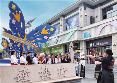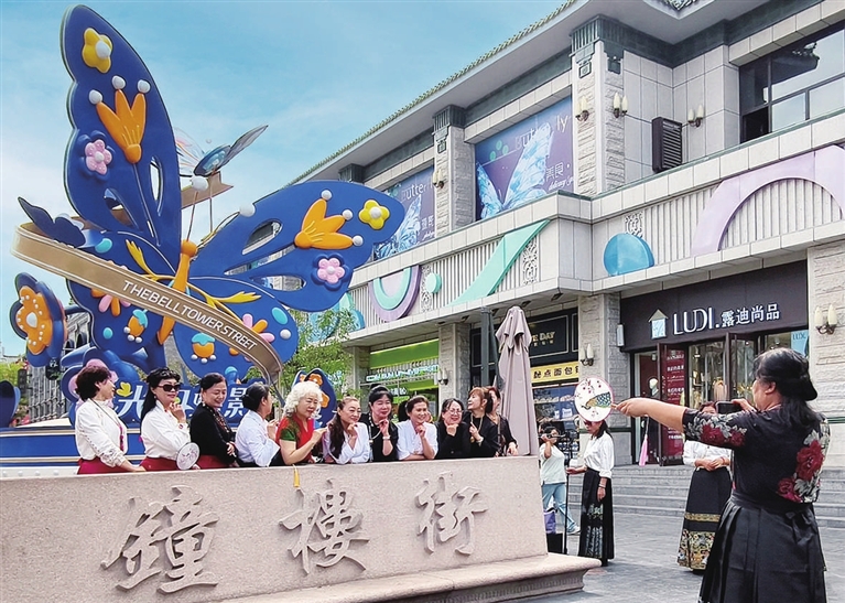中秋节期间,钟楼街东西入口的街头装置景观“上新”,吸引游客拍照打卡。图为9月17日,游客在新景观前合影留念。 刘敏 平原摄影报道