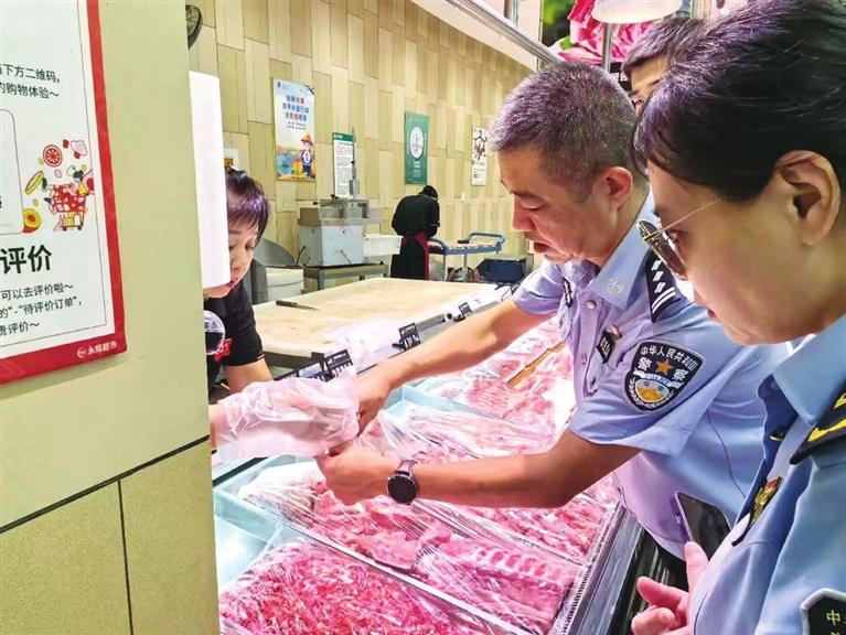 9月18日,桥东派出所民警联合迎泽区市场监督管理局执法人员,走访辖区超市、菜市场开展肉制品抽检工作,逐一查看经营商户的营业执照,核实产品来源渠道、检疫检验证明、产品合格证明、进货凭证和记录等内容,保障消费者舌尖上的安全。 辛欣 王宪炜 摄
