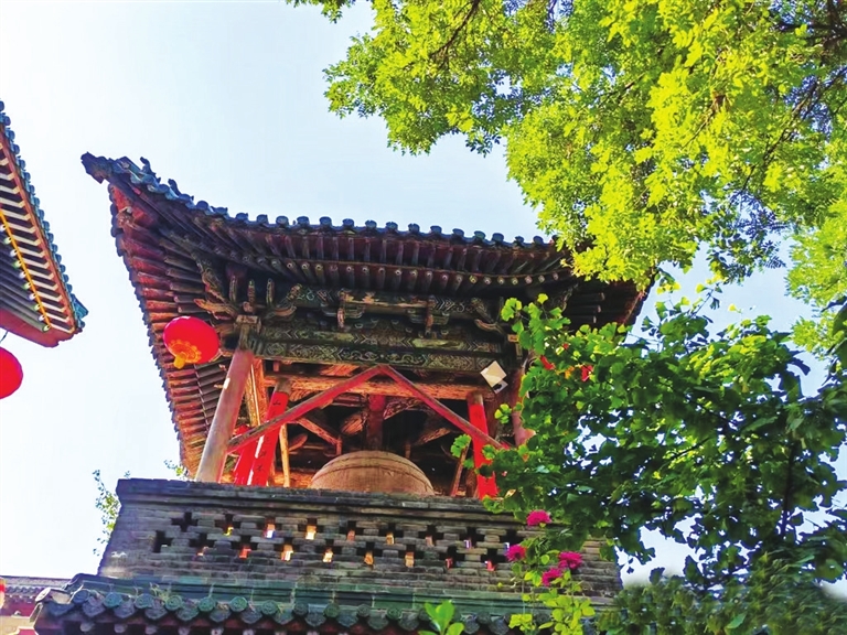 山门两侧是钟楼和鼓楼,据说钟楼上的大钟,是明代正德年间铸造,有9999斤重,声音洪亮,敲响的时候,整个太原府城都可以听到。可惜不能上去近距离参观,只能在楼下踮起脚、隔着围墙眺望眺望。