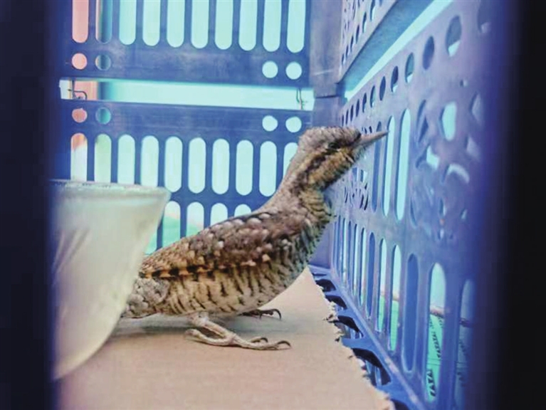 李嘉祯接到电话后,立即来到幼儿园实地查看受伤小鸟的情况。乍一看,小鸟外形与啄木鸟相似,但其颈部有轻微伤,暂时无法正常飞行。社区工作人员随即联系了太原市野生动物保护协会。经过协会相关人士推断,这只羽毛靓丽的小鸟为蚁鴷。野生动物保护协会的工作人员表示,可以给蚁鴷喂食一些虫子和水,待它情况好转,如果可以自行飞走,就让其回归自然,如果暂时飞不走,该协会将带其回去治疗。