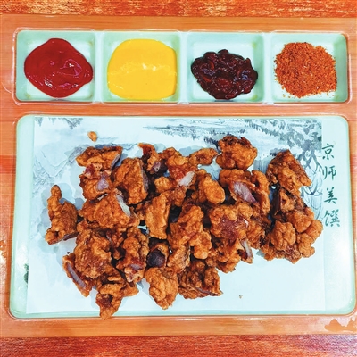 在徐丑子饺子坊,酥肉炸好后有多种吃法。最常见的就是复炸后直接吃。徐丑子炸酥肉是店里的镇店之宝,炸好的酥肉,金黄诱人、外酥里嫩,老少皆宜、桌桌必点。为增添这道菜的风味,郭红刚也贴心准备了番茄酱、蜂蜜芥末酱、黄豆酱、椒盐四款蘸料,让食客们可以根据自己的喜好选择搭配,享受独一无二的酥肉盛宴。