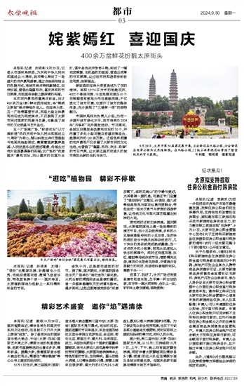 赏花同时还有文娱表演。国庆期间,太原植物园将上演一场场精彩的演艺节目,如小丑杂技表演,多彩的小丑服装搭配夸张的小丑妆容,在欢快热闹的音乐中展示各种杂技技巧,几个快乐的男孩或爬或跳或翻腾,加一点点欢乐的小故事,把观众迅速拉入快乐的氛围中。同时还有莲花落、抖杠、蹬鼓等传统杂技节目;植物精灵巡游,演员们化身奇花异草,尽情展示自身魅力的同时,向游客科普植物知识,寓教于乐……