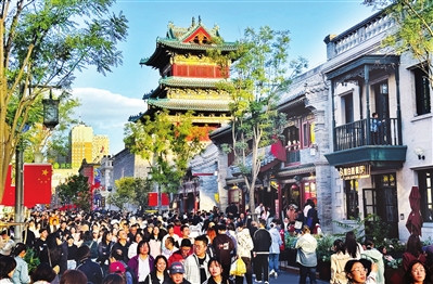 10月7日,钟楼街上游人如织,处处洋溢着喜庆的节日气息。
