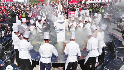 各色美食轮番上阵,美食街上人头攒动,游客络绎不绝。在美食街的中央,一列长队成了最引人注目的风景线,长队尽头是一口直径足有4米的大锅。锅内汤水翻滚,腾起热气,近百名刀削面师傅身着统一的厨师服,列阵般围站在锅前,或手托面团,或手持面案,或以头顶面,正在施展绝世“刀法”。据统计,在“百人削面,万人品尝”活动中,数万名游客品尝地道的山西刀削面,感受中华美食的魅力,成了清源水城一道亮丽风景线。