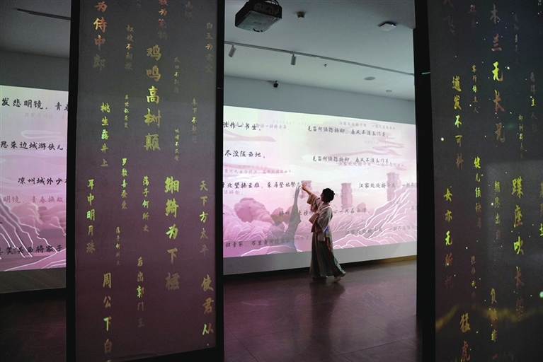 7月9日,讲解员在武威汉唐天马城凉州词馆介绍《凉州词》。