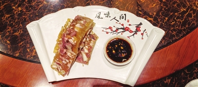 另一边,热菜大厨郭师傅,正在完成饭店热菜中的特色菜——红烧肉。上好的五花肉是基础,十多种配料是基本,将一整块五花肉上笼蒸,至七八成熟的时候,改刀,定型,然后再炒糖色,将五花肉二次下锅,翻炒,加水炖一个多小时,红烧肉才可完成。郭师傅介绍,相比较传统红烧肉的油炸法,高温蒸更显得温和,肉质更软更糯,肥而不腻。