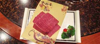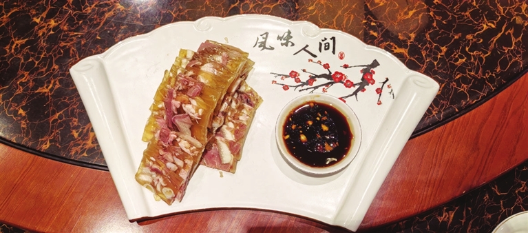 9月底的一天,天气阴沉,远处不时传来几声雷声,略有几分寒意。晋庭小院厨房内,却是一片火热。凉菜大厨韩师傅正在制作着店内凉菜系列的主打菜——羊头肉。韩师傅边做边介绍,这是平遥特色的羊头肉,从浸泡、清洗、切割、炖煮、直至自然放凉,整套工序要近6个小时。制作完成的羊头肉,与北方人常做的猪皮冻相似,但其内容又比猪皮冻更丰富,更有层次感,更有营养。来店用餐的人们点一盘羊头肉,蘸蒜醋,别有滋味。