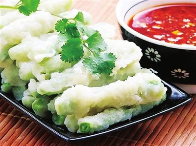 诸料齐备,就可以烧水做沾片子了。饭店为了美观,做玉谷叶的沾片子通常只沾一面,豆角也保持整根原形,这样出锅时白绿相间,蔬菜还保持着原状,看起来齐整漂亮。家常制作时,可以依个人喜好,把洗净的菜品改刀成大小适宜的形状。