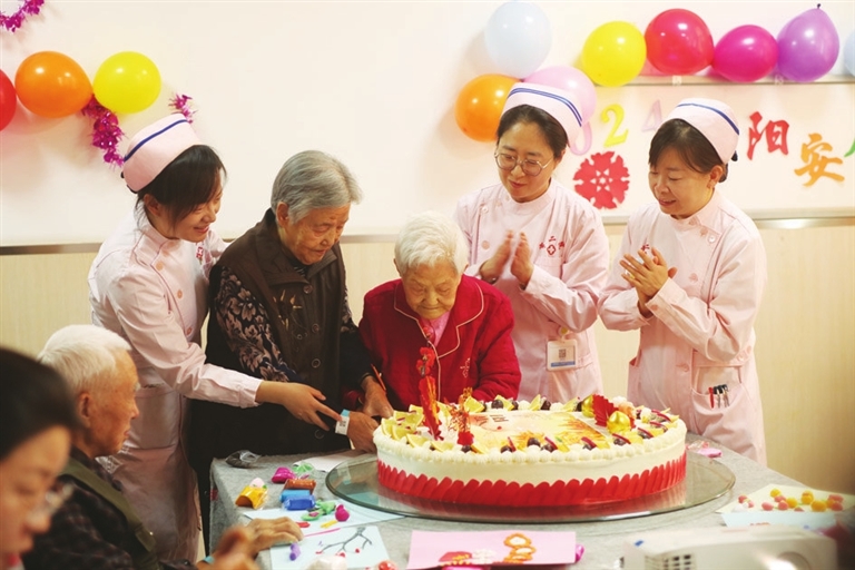 10月11日,太原市第二人民医院组织老年病患共度重阳节,并为老人分发蛋糕。 张澍宏 摄