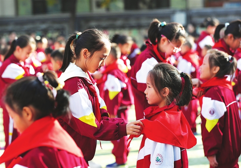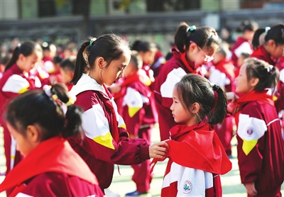 10月12日,以“红领巾爱祖国”为主题的中国少年先锋队建队75周年主题队日活动在迎泽区新西小学举办,125名小学生正式成为少先队的一员。 王韵菲 狄佳玮 摄影报道