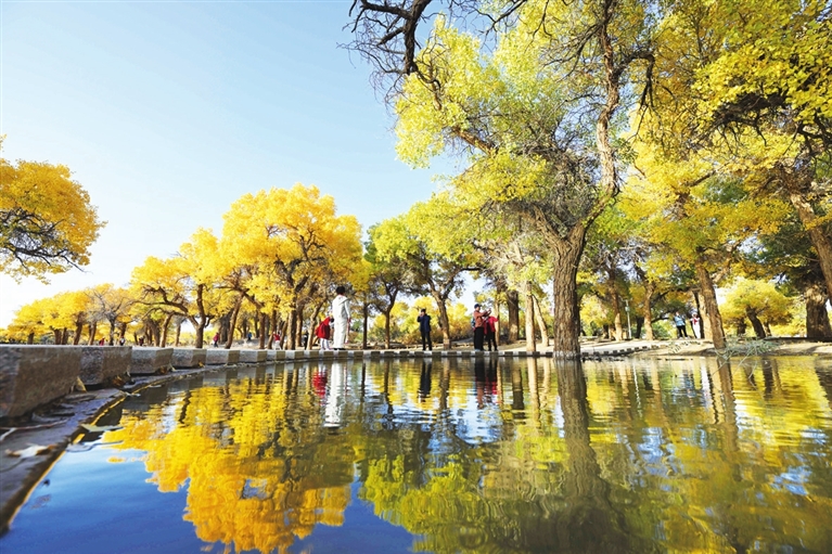 10月13日,游客在内蒙古阿拉善盟额济纳旗大漠胡杨林景区游玩。