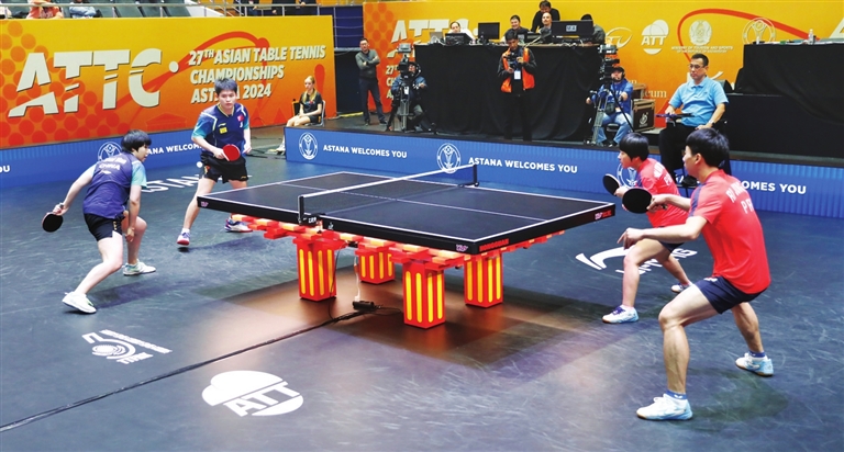 10月12日,蒯曼(左一)/林诗栋(左二)和李正植(右一)/金琴英(右二)在比赛中。当日,在哈萨克斯坦阿斯塔纳举行的第27届亚洲乒乓球锦标赛混双决赛中,中国组合林诗栋/蒯曼3比1战胜朝鲜组合李正植/金琴英,夺得冠军。 新华社 发