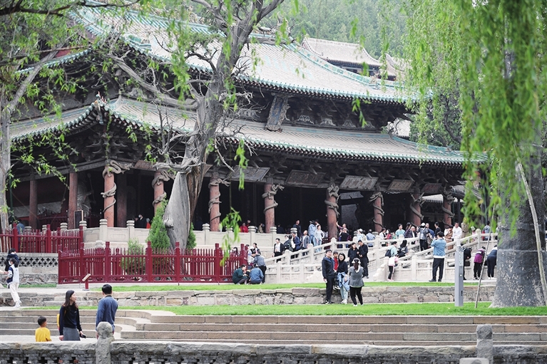 殿前廊柱上盘旋着8条龙,左边的左旋,右边的右旋,有一条还比出了剪刀手,活泼泼的8条龙是中国现存最早的木雕盘龙柱,是北宋元祐二年(1087)太原知府吕吉等人主持雕造的,中间是应龙,往两边分别是蟠龙、蛟龙、螭龙,怒目利爪,鳞片秩然,须发根根,尽管落满灰尘,也如当年一样守护着大殿。