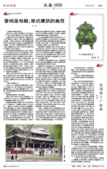 几百年后,梁思成与林徽因去往汾阳途中,在晋祠背后,看到了“魁伟的殿顶,雄大的斗拱,深远的出檐”,那是他们第一次看到圣母殿,后来,林徽因写道,“同时受到五代南方的秀丽和唐代北方壮硕风格的影响,或多或少已是南北作风的结合,太原晋祠圣母殿是这一作风的范例”。