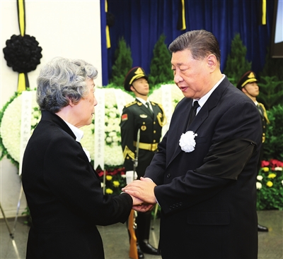 10月14日,吴邦国同志遗体在北京八宝山革命公墓火化。习近平、赵乐际、王沪宁、蔡奇、丁薛祥、李希、韩正等前往八宝山送别,胡锦涛送花圈表示哀悼。这是习近平与吴邦国亲属握手,表示深切慰问。