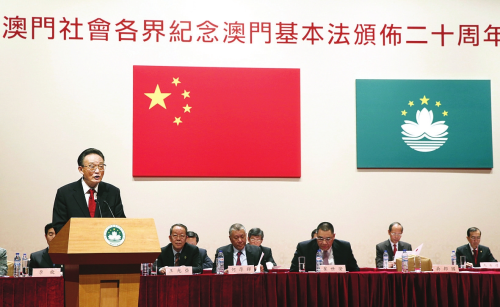 2013年2月21日,吴邦国同志在澳门文化中心出席澳门社会各界纪念澳门基本法颁布20周年启动大会并发表讲话。 本版图片均据新华社