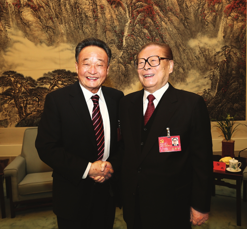 2012年11月14日,中国共产党第十八次全国代表大会在北京闭幕。这是闭幕会前,江泽民同志与吴邦国同志在一起。