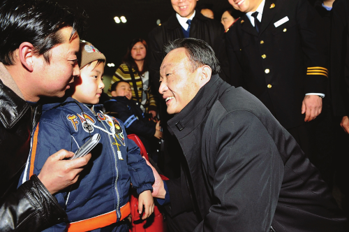 2008年2月3日,吴邦国同志在北京西站候车室与旅客交谈。