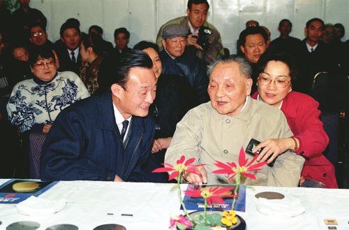1992年2月10日,邓小平同志在上海贝岭微电子制造有限公司参观时与吴邦国同志交谈。
