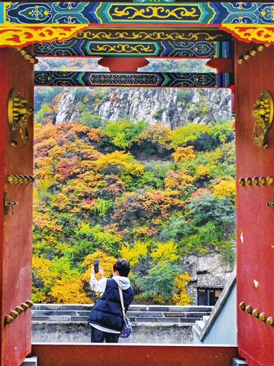 10月16日,尖草坪区西张村红叶沟,层林尽染、色彩斑斓,美景如画。图为游客在拍照留念。