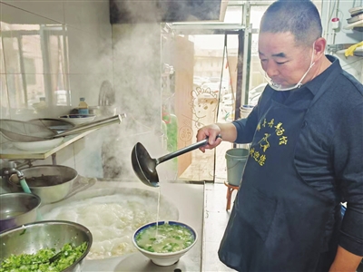 店里拾掇得利利索索、干干净净。早上7时开门营业,晚上10时许打烊,羊汤馆每天能用掉1只半到2只羊,日复一日,用美味拴住食客味蕾。