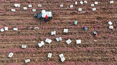 10月16日,清徐县徐沟镇清德铺村红薯产业基地,村民们正在收获红薯。今年,该村红薯喜获丰收,亩产量最高达4000公斤。 张昊宇 摄