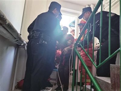 当天上午11时18分,职工新村派出所接到群众报警求助,称一位老人从三楼楼道窗户爬到窗外。接警后,值班民警潘瑞宵立即带领辅警任晋东、齐琛火速奔赴现场。民警、辅警抵达居民楼下时,看到老人坐在三楼、四楼之间的窗外,四周毫无防护,处境十分危险。民警立即跑上楼,发现楼道的两扇窗户极为狭窄,根本无法实施救援。于是,民警当机立断,迅速将窗户拆下,为救援创造充足空间。